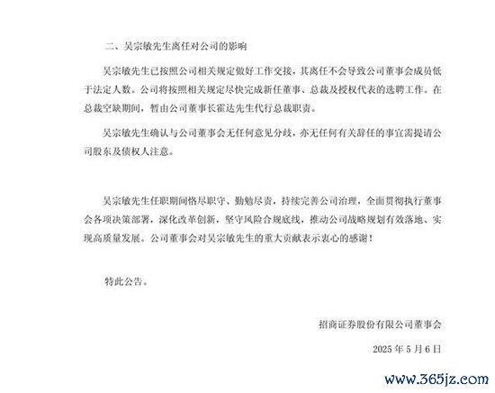 公告同时提到,招商证券董事会对吴宗敏的重大贡献表示衷心的感谢,并做了“任职期间恪尽职守、勤勉尽责,持续完善公司治理,全面贯彻执行董事会各项决策部署,深化改革创新,坚守风险合规底线,推动公司战略规划有效落地、实现高质量发展”的任职评价。